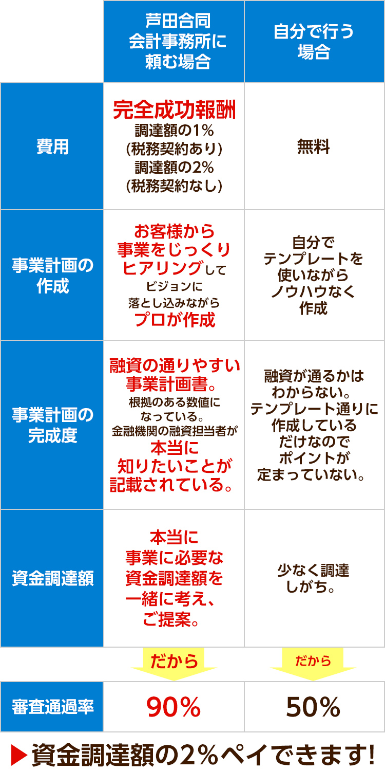 創業融資を含め、年間200件以上の事業計画を作成している芦田合同会計事務所なら、あなたの潜在能力を最大限に引き出した事業計画の作成が可能です!