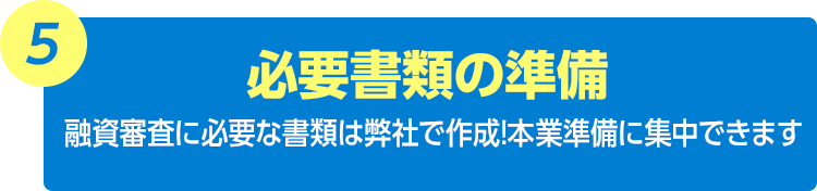 また、融資の際に必要となる煩雑な書類については弊社で作成するため、迅速に融資が受けられます。 -